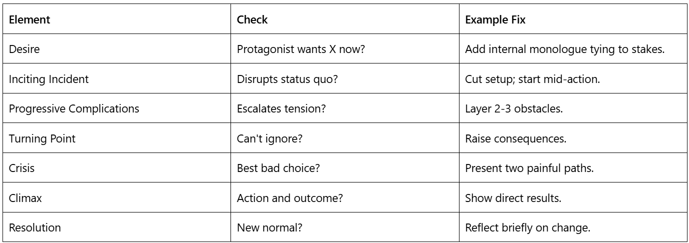 Resolution wraps the “new normal”: quieter reflection on what changed, planting seeds for the next scene. A strong close leaves readers satisfied yet hungry for more, with the character’s desire evolved or defeated.